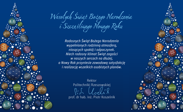 Najserdeczniejsze życzenia z okazji Świąt Bożego Narodzenia składa rektor Politechniki Rzeszowskiej prof. dr hab. inż. Piotr Koszelnik.