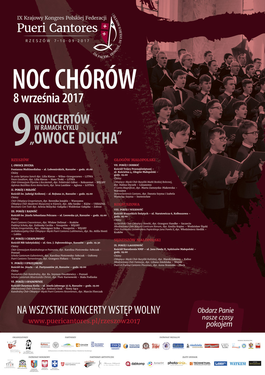 Od 7 do 10 września br. odbędzie się w Rzeszowie IX Krajowy Kongres Polskiej Federacji Pueri Cantores. Jest to spotkanie chórzystów z całej Polski, w trakcie którego młodzi ludzie mają okazję do wspólnych spotkań, koncertów i modlitwy przez śpiew chóralny. W wydarzeniu na zaproszenie organizatorów Polskiej Federacji Pueri Cantores i Katedralnego Chóru Chłopięco-Męskiego Pueri Cantores Resovienses weźmie udział około tysiąc chórzystów z całej Polski (blisko 30 chórów) i z zagranicy (Litwy, Łotwy, Ukrainy i Węgier).