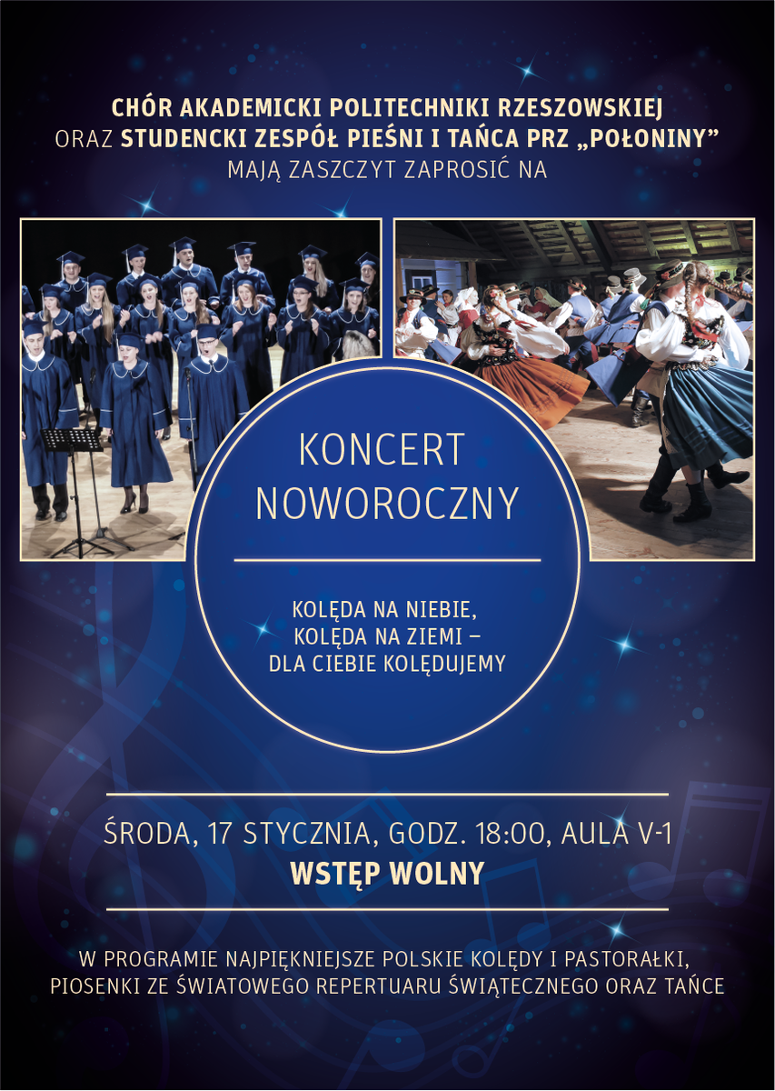 W imieniu Chóru Akademickiego Politechniki Rzeszowskiej oraz Studenckiego Zespołu Pieśni i Tańca Politechniki Rzeszowskiej "POŁONINY" zapraszamy całą społeczność akademicką na koncert noworoczny „Kolęda na niebie, kolęda na ziemi - dla Ciebie kolędujemy".
